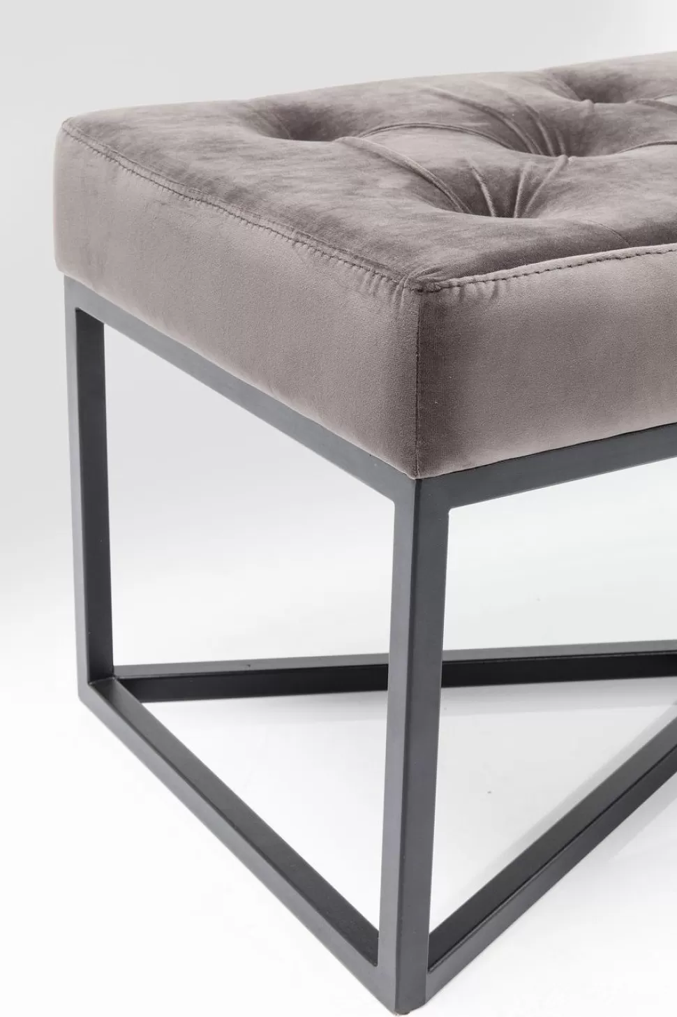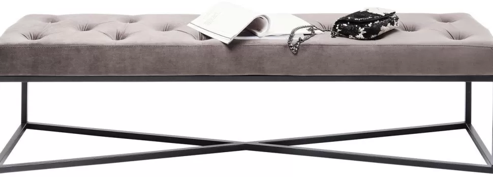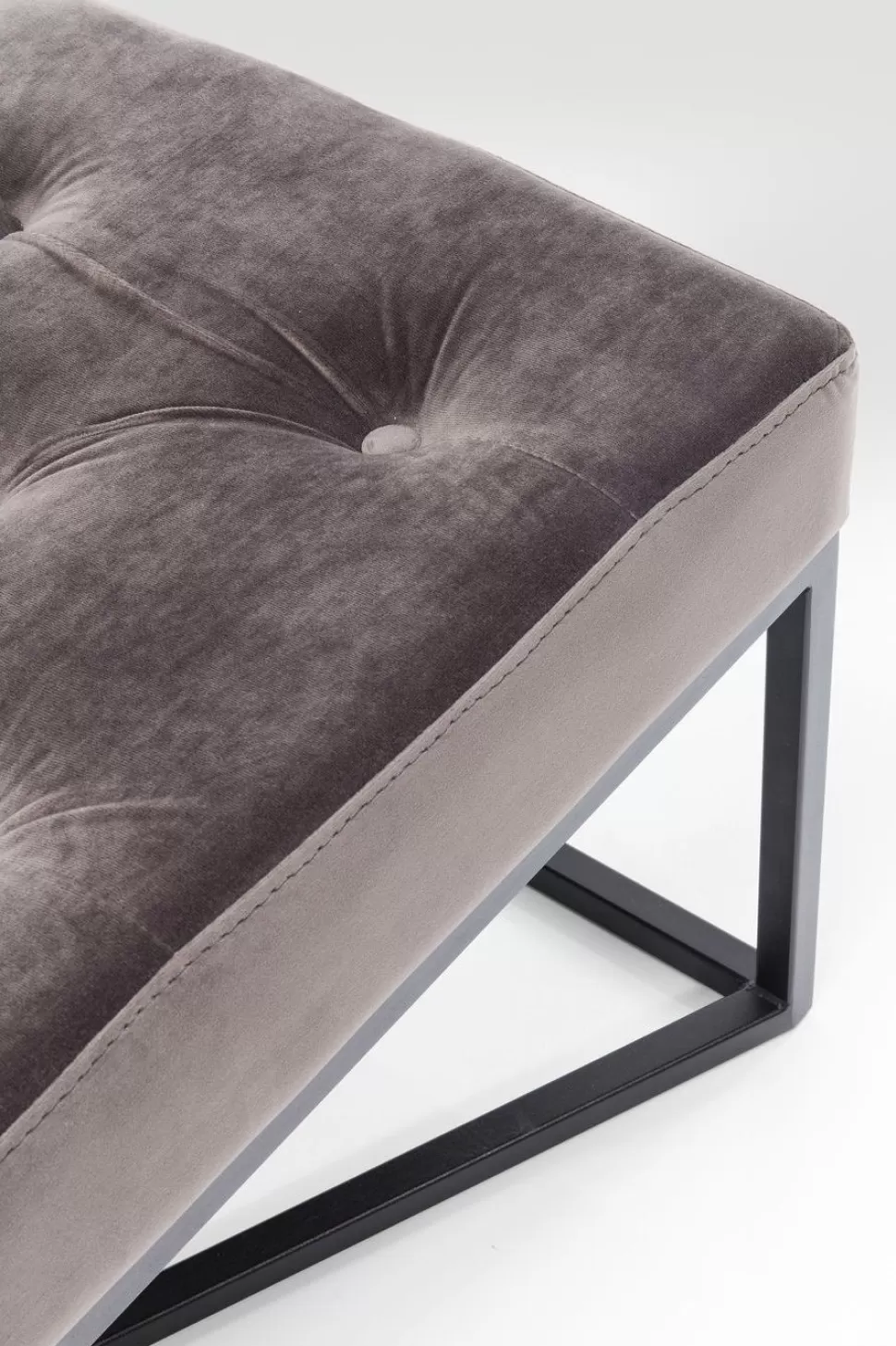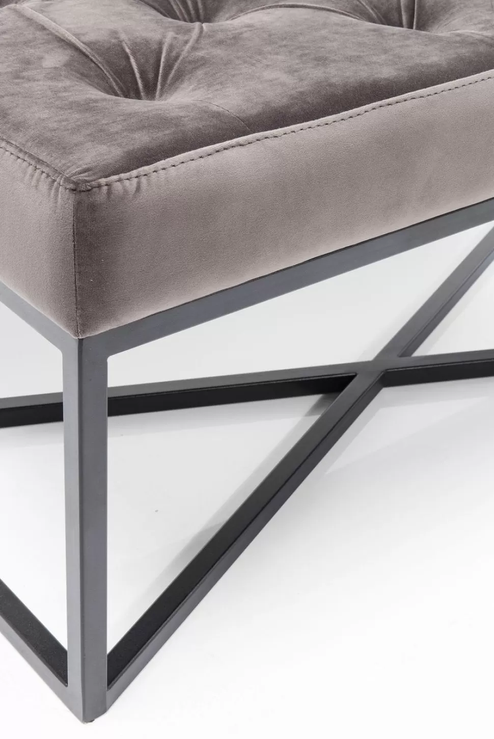 Wyściełana ławka welurowa w stylu nowoczesnym Crossover dostępna jest w kilku wariantach – tutaj tapicerowana ławka welurowa szara o wymiarach (szerokość x głębokość x wysokość): 150x40x40 cm.