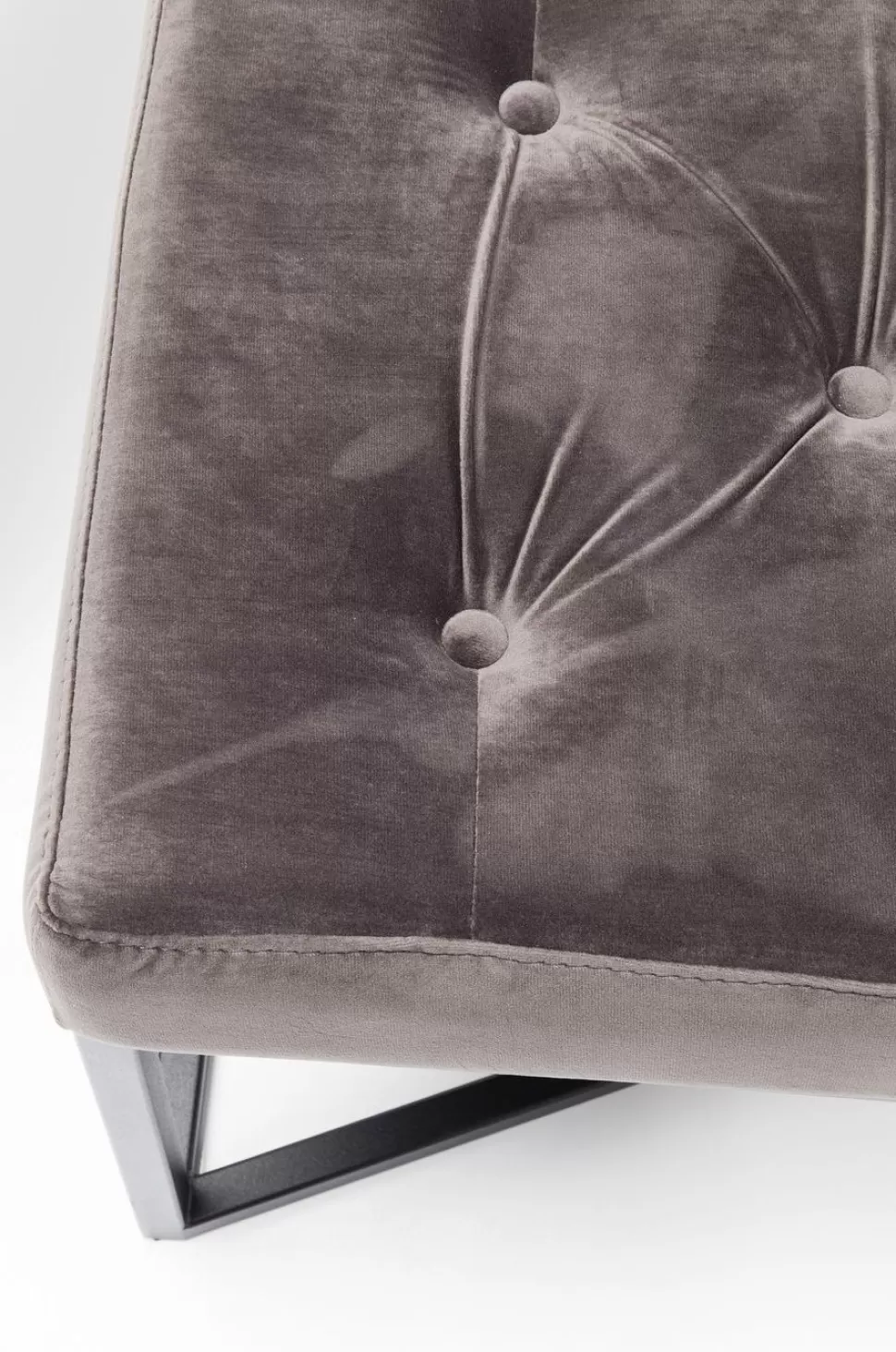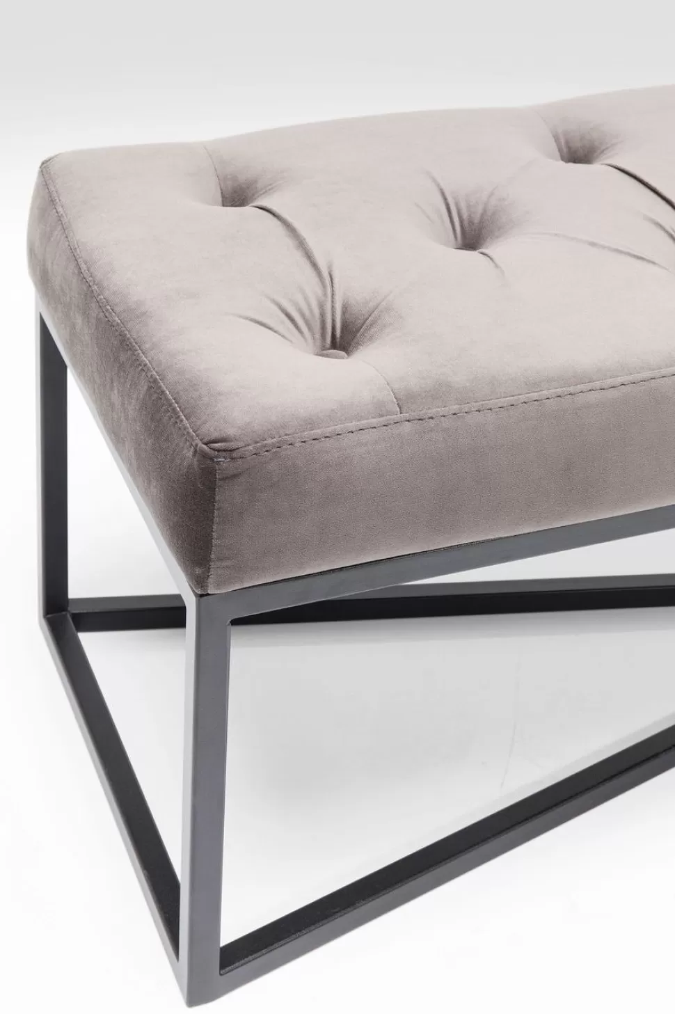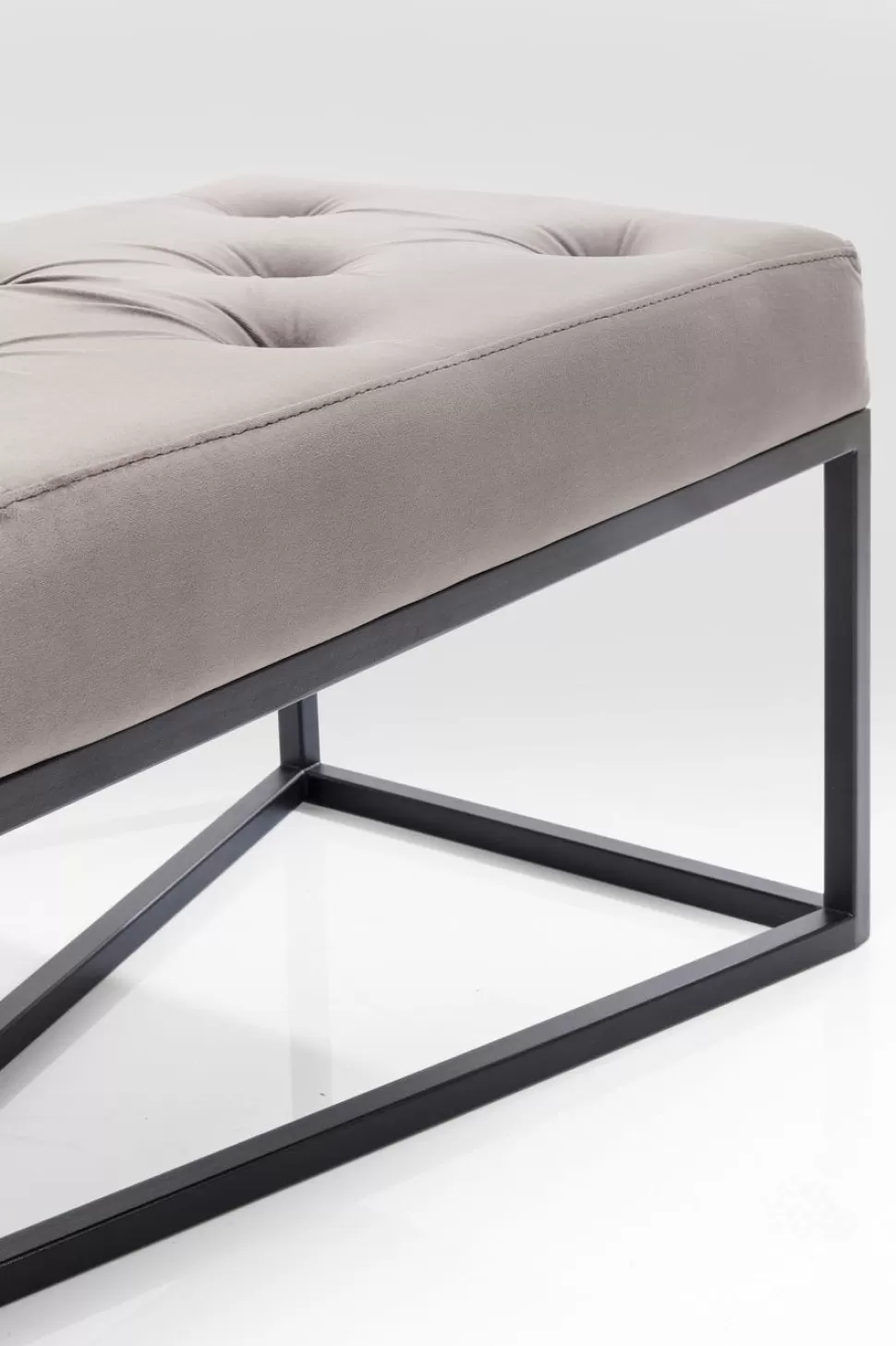 Wyściełana ławka welurowa w stylu nowoczesnym Crossover dostępna jest w kilku wariantach – tutaj tapicerowana ławka welurowa szara o wymiarach (szerokość x głębokość x wysokość): 150x40x40 cm.