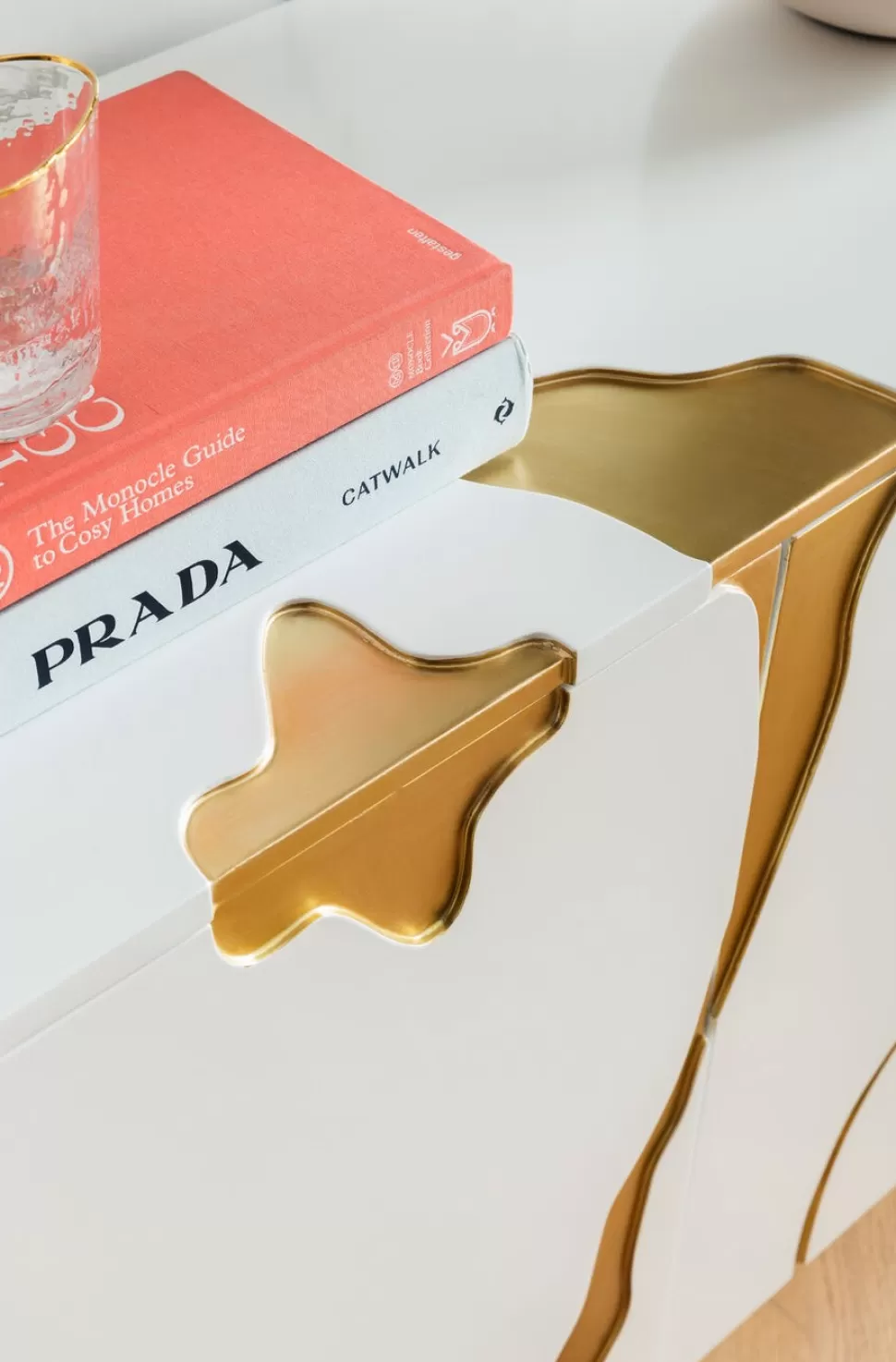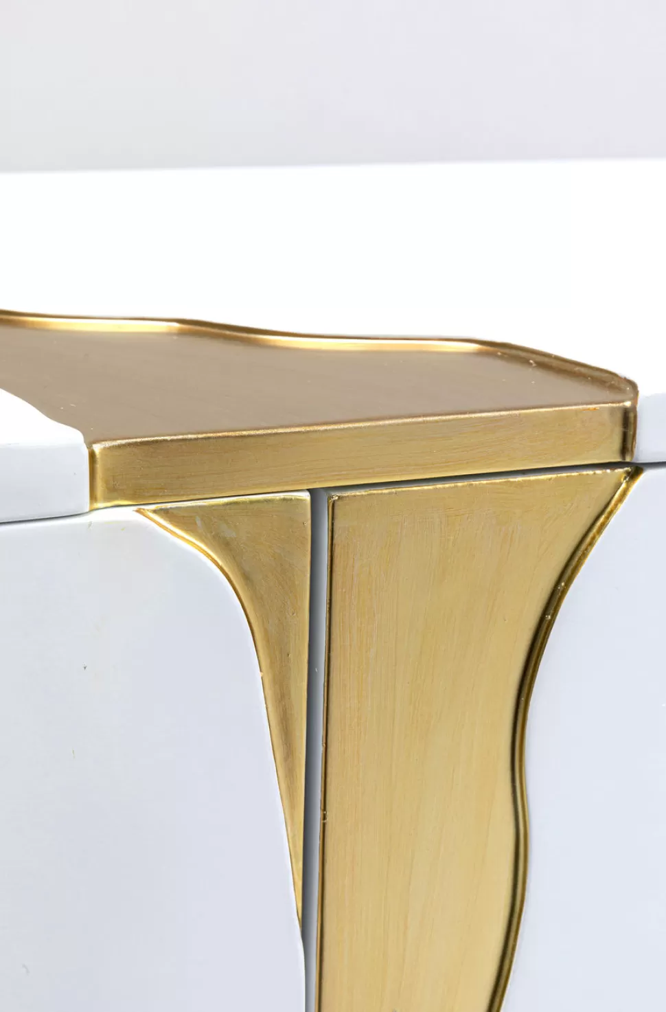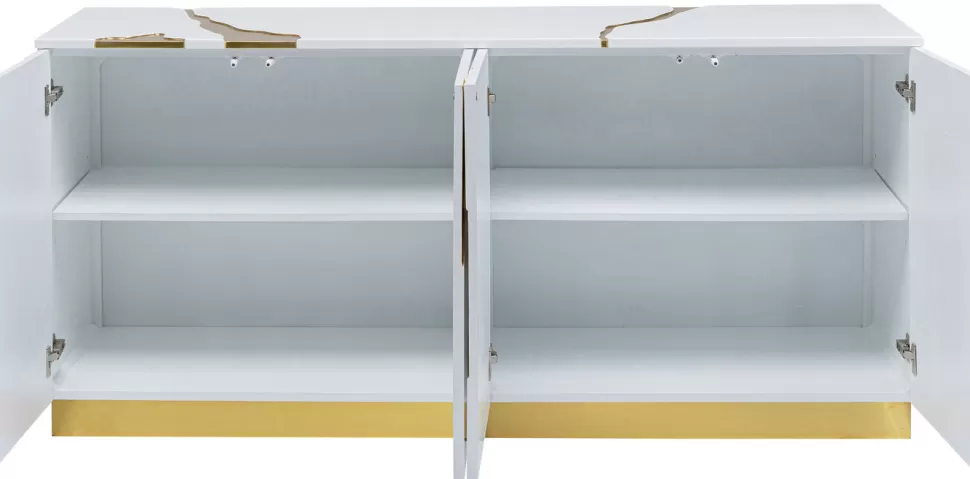Komoda Cracked 165×80 cm biało-złota Korpus: płyta MDF lakierowana.Podstawa: stal malowana proszkowo.Wzory – ręczne …